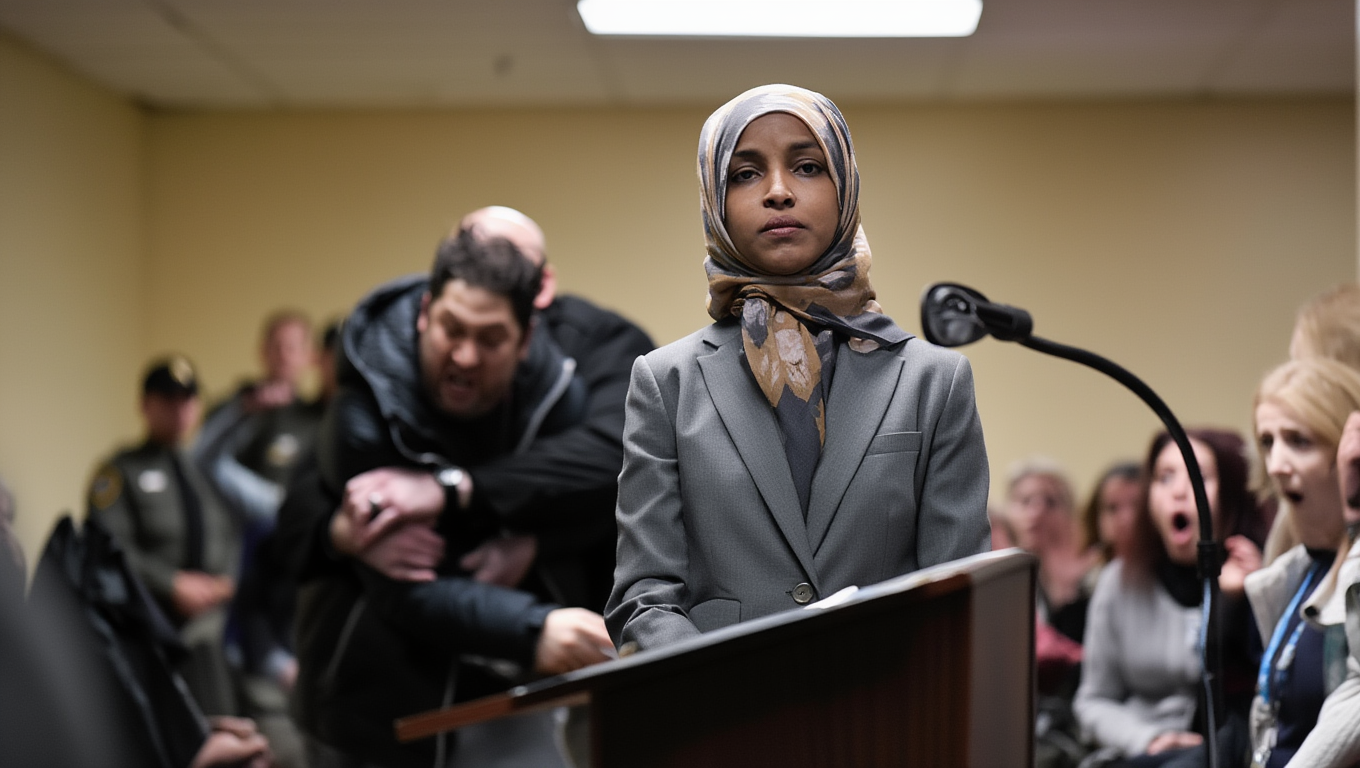 Representative Ilhan Omar was assaulted during a Minnesota town hall when a 55-year-old man sprayed her with apple cider vinegar using a syringe-like device before being tackled by security.